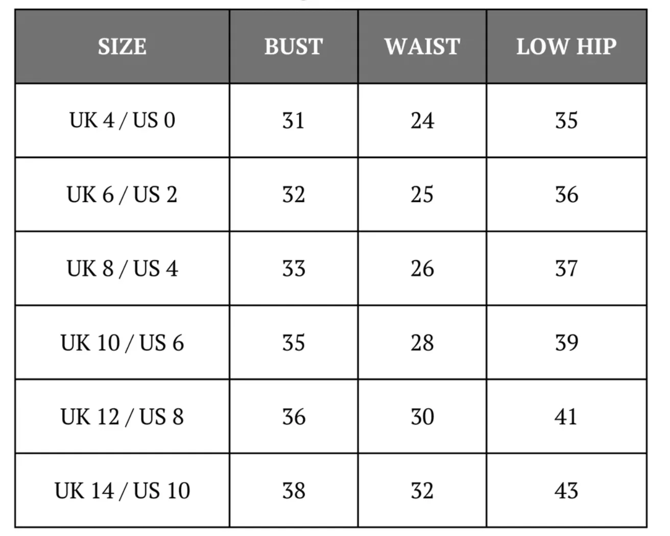 This size guide is in inches. Rosie Etienne recommend ordering based on the size chart. They do not recommend sizing up or down.